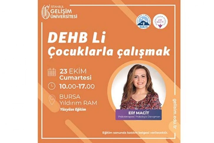 23 Ekim günü, “DEHB'li Çocuklarla Çalışmak” adlı eğitim Bursa'da başlıyor. Psikoterapist ve Psikolojik Danışman Elif Macit tarafından verilecek eğitim, Bursa İl Milli Eğitim Müdürlüğü ve İstanbul Gelişim Üniversitesi tarafından gerçekleştirilecek.