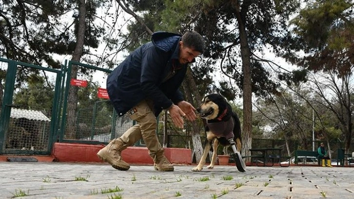 AFAD ekipleri tarafından kendilerine haber verildiğini belirten Sarıçiçek, "Bizim ekiplerimiz de gidip alıp barınağa getirdi. Köpek geldiğinde korkuyordu. Büyükşehir Belediyesinde görevli hekim arkadaşlarımız enkazda ezilen ön sol ayağını ampute ettikten sonra protez yapılmasına karar verildi. Şu an henüz tam yürüyemiyor ama her gün alışması için çalıştırıyoruz." dedi.