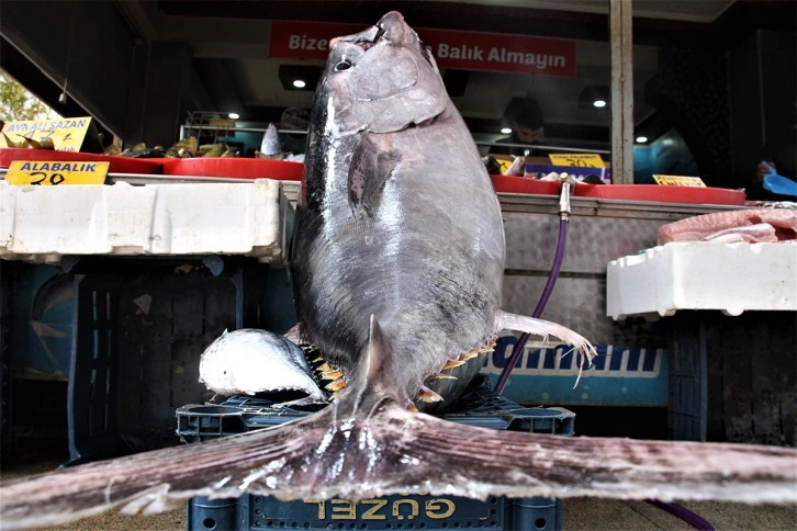 Samsun'da balıkçılar tarafından yakalanan dev orkinos balığı, Elazığ'da bir balıkçıda sergilendi. 180 santimetre uzunluğunda ve 144 kilo ağırlığındaki dev orkinos yoldan geçen vatandaşların ilgi odağı oldu. Orkinosun kilosunun 70 liradan satışa çıkarılacağı belirtilirken vatandaşlar da balıkla sırayla fotoğraf çekti.