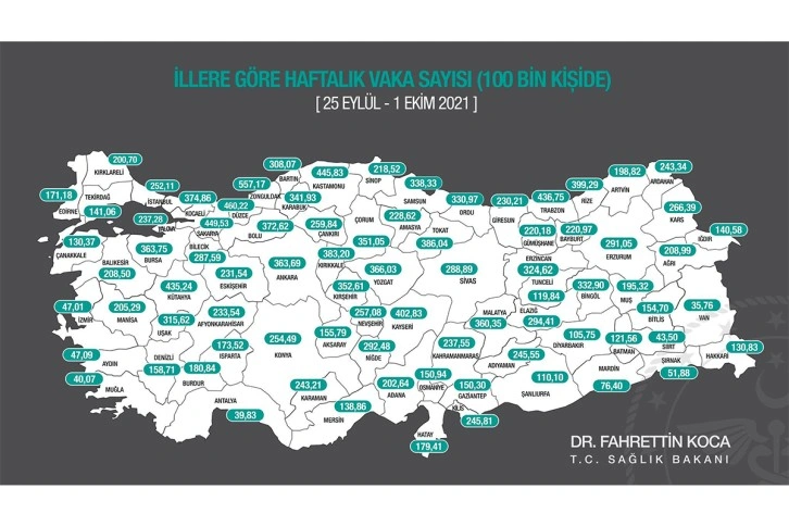 Sağlık Bakanı Prof. Dr. Fahrettin Koca, 25 Eylül 1 Ekim arasında illere göre haftalık vaka sayılarını açıklamasının ardından Düzce'de ki vaka sayıları da belli oldu. Buna göre Düzce'de bin 821 vaka bulunuyor.