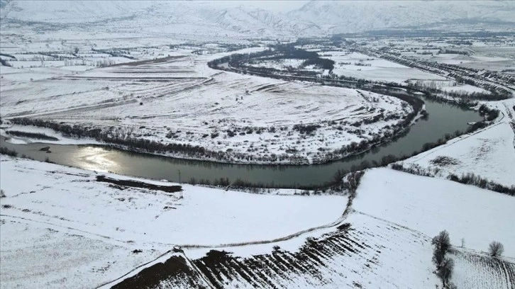 Bembeyaz kar örtüsünün arasından süzülen nehrin kıvrımlarının oluşturduğu eşsiz manzara drone ile görüntülendi.