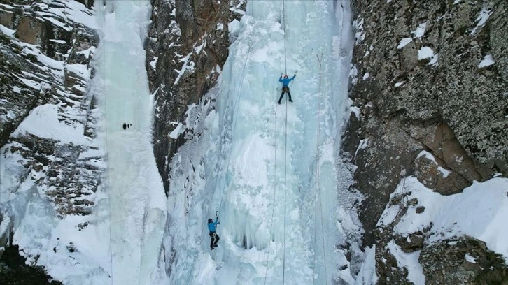 Erzurum'da bu yıl 8'incisi düzenlenen "Uluslararası Emrah Özbay Buz ve Kaya Tırmanışı" kapsamında kente gelen sporcular, metrelerce yükseklikteki buzla kaplı doğal şelalelere tırmandı.