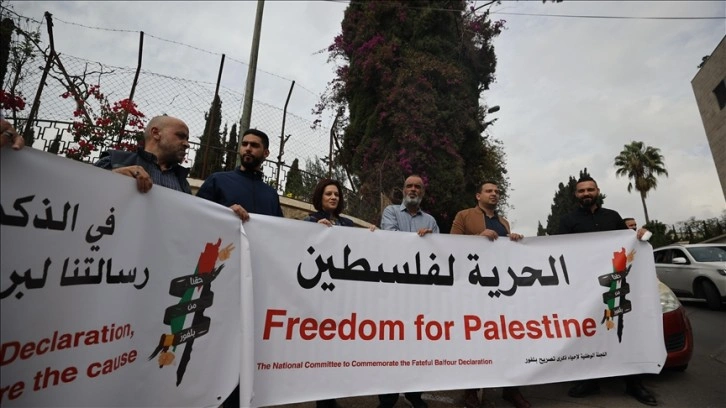 Aralarında Kudüs ve Filistin Müftüsü Şeyh Muhammed Hüseyin’in de bulunduğu bir grup Filistinli, Balfour Deklarasyonu'nun 104’üncü yıldönümü münasebetiyle işgal altındaki Doğu Kudüs’te bulunan İngiltere Başkonsolosluğu önünde gösteri düzenledi.