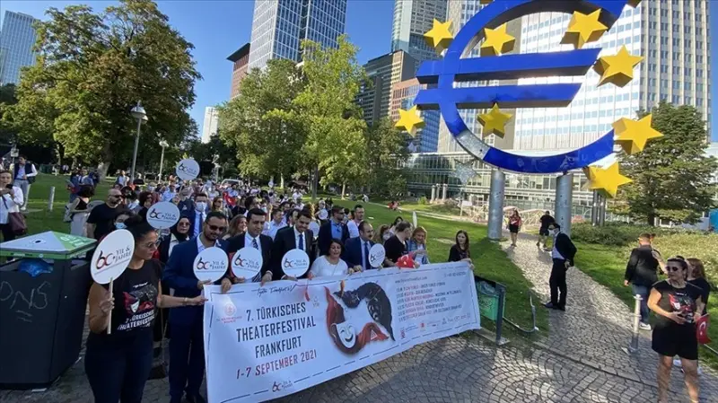 05.09.2021YTB Başkanı Abdullah Eren, Türkiye'nin Frankfurt Başkonsolosu Erdem Tunçer, Türk tiyatrosunun önemli isimlerinden Selçuk Yöntem, Begüm Birgören, Reha Özcan ile yönetmen Hilal Saral'ın yanı sıra çevre sakinlerinin katıldığı yürüyüş öncesi, Anadolu'dan Avrupa'ya 60 yıl önce başlayan iş göçünü canlandıran tiyatro sanatçıları ellerinde tahta bavulları ve bebekleriyle Frankfurt tren istasyonundan çıkarak kortejin yürüyüşe geçeceği alana geldi.