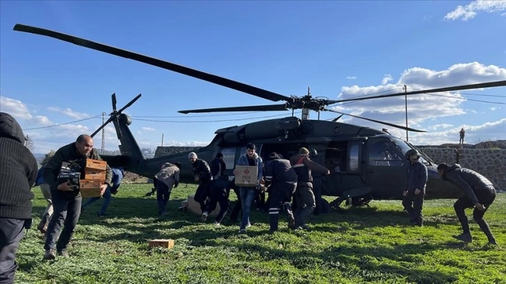 Mahallelerde uygun yerlere iniş yapan helikopterlerdeki askeri personel, yardım malzemelerini depremzedelere dağıttı.