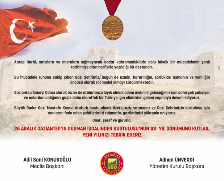 Gündem GAZİANTEP SANAYİ ODASI 25 ARALIK KURTULUŞ BAYRAMI KUTLAMA MESAJI GAZİANTEP SANAYİ ODASI 25 ARALIK KURTULUŞ BAYRAMI KUTLAMA MESAJI 23-12-2022 11:09 23-12-2022 11:11 711 OKUNMA