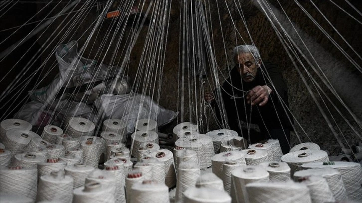 Mehmet Ali Macık, mağaraya getirdiği fabrika atığı malzemeleri, ahşaptan yapılan silindir şeklindeki çıkrığa sarıyor. Tezgahı elle çevirerek iplik haline getirdiği ürünü, tezgahlar arasında yürüyerek topluyor.