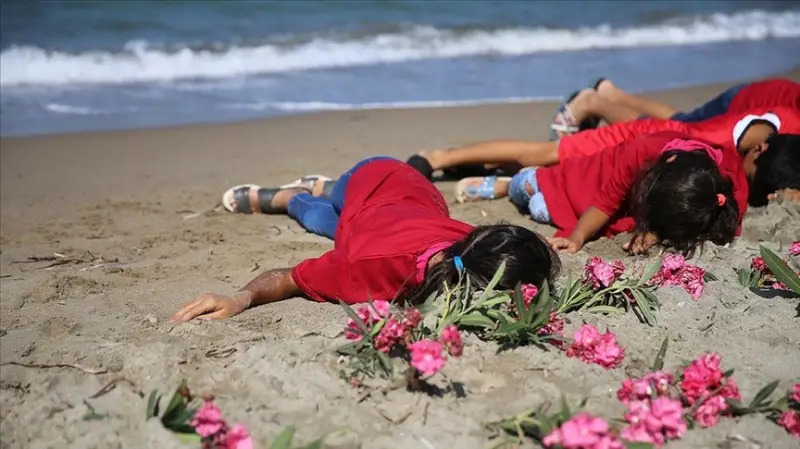 Sahile begonvil çiçekleriyle "Aylan Baby" yazıldı. Aralarında çocukların da bulunduğu grup, aynı Alan bebeğin cansız bedeninin sahile vurduğu gibi kıyıya uzanarak, mültecilerin yaşadığı drama dikkat çekmeye çalıştı.