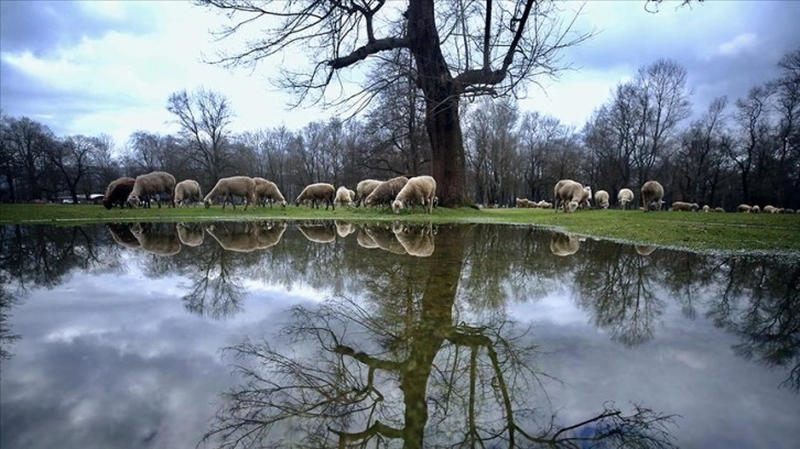 Karın ardından parkın suyla kaplandığını gören ziyaretçiler fotoğraf çektirdi.