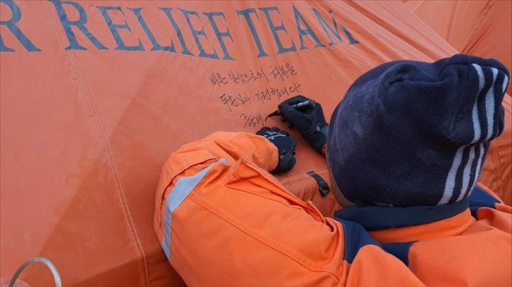 AA muhabiri, Güney Kore'den gelen arama kurtarma ekibinin Hatay'ın Antakya ilçesindeki arama kurtarma çalışmalarını ve konakladıkları çadırlara yazdıkları mesajları derledi.