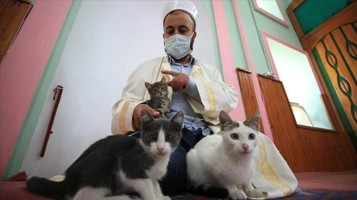 Hüseyin Koçak, 5 yıl önce göreve başladığı köy camisinin avlusunda bir kış günü gördüğü annesiz kedi yavrularını caminin içine alarak bakmaya başladı.