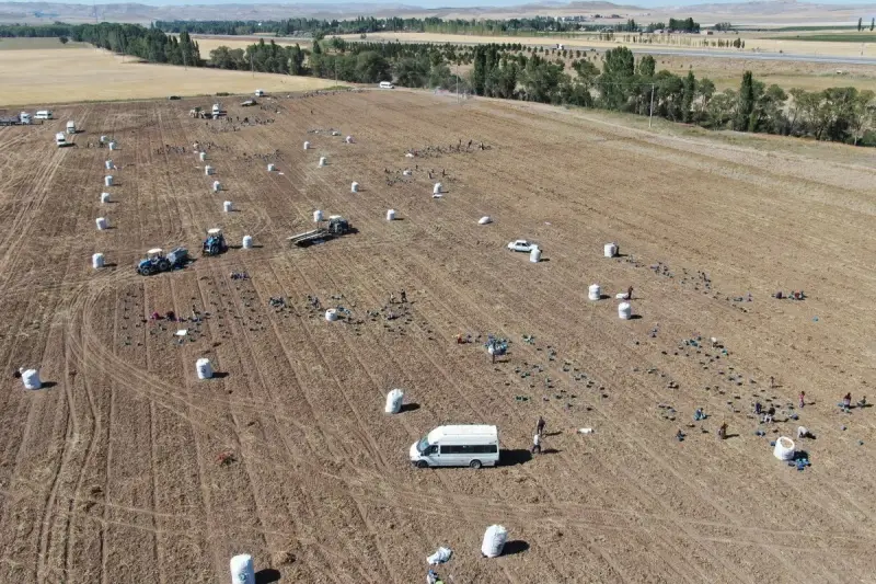 Sivas'ın Ulaş ilçesinde tohumluk patatesin hasadı başladı, mevsimlik işçilerin ise karınca gibi çalışması havadan drone ile görüntülendi.
