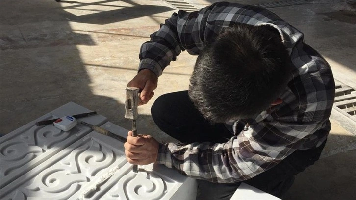 İslam taş işleme sanatının geometrik şekillerini elleriyle mermere işliyor