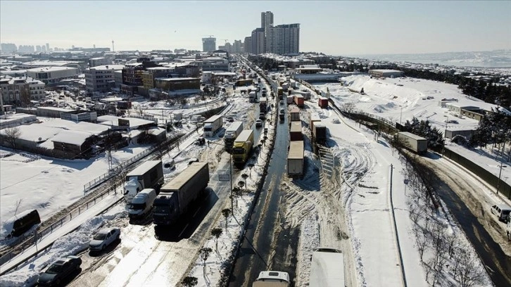 Çoğunluğu ağır vasıta olan araçların ilerleyememesi nedeniyle trafiğin tek şeritten sağlandığı yolda, İstanbul Büyükşehir Belediyesi ve Karayolları Genel Müdürlüğü ekipleri çalışıyor.