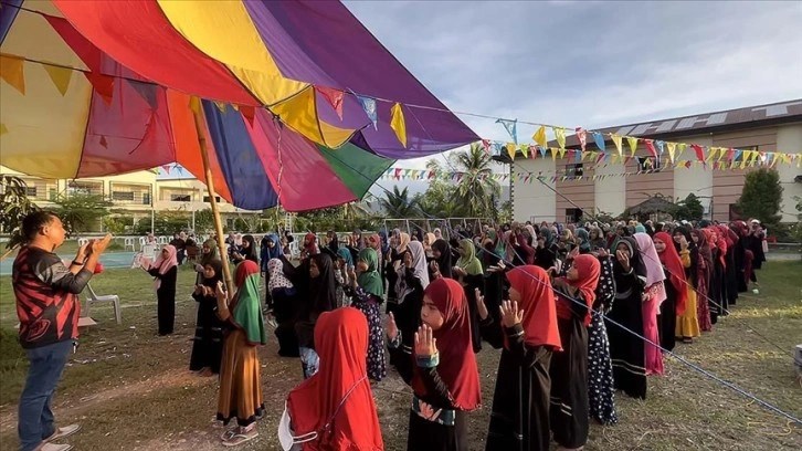 Çocuklar, Müslüman Mindanao'da Bangsamoro Özerk Yönetimi'nin (BARMM) başkenti Cotabato City'de kaldıkları İHH İnsani Yardım Vakfına ait Uğur Süleyman Söylemez Yetimhanesinin bahçesinde toplandı.