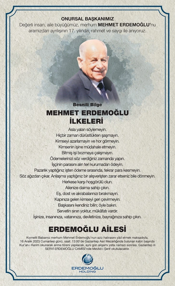 Gündem ERDEMOĞLU HOLDİNG ANMA İLANI ERDEMOĞLU HOLDİNG ANMA İLANI 15-12-2023 12:53 03-01-2024 12:56 363 OKUNMA