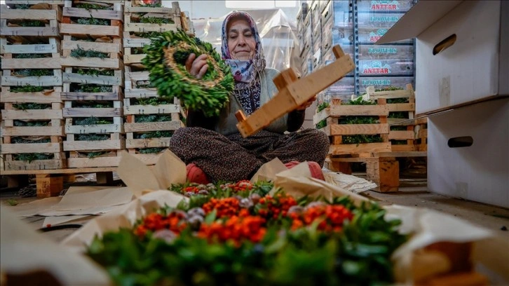 Hristiyanların kapı, mezarlık ve yemek masası gibi alanlarda kullandığı Noel çelenkleri, ihracatçı firmaların siparişleri doğrultusunda ağustos ayından aralık ayının ilk haftasına kadar Antalya'da kadınlar tarafından hazırlanıyor.