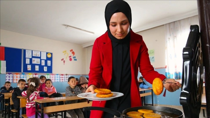 Gaziantep'in Şehitkamil ilçesindeki köy okulunda görevli 3 kadın öğretmen, öğrencilerinin daha önce yemediği hamburger, pizza, köri soslu spagetti gibi lezzetleri sınıfta odun sobasında pişirip çocuklara tattırıyor.