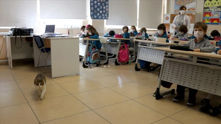 Raşit Efendi İlkokulu öğrencileri, yaklaşık 3 ay önce soğuk havada okulun bahçesine gelen kediyi üşümemesi için sınıfa aldı.