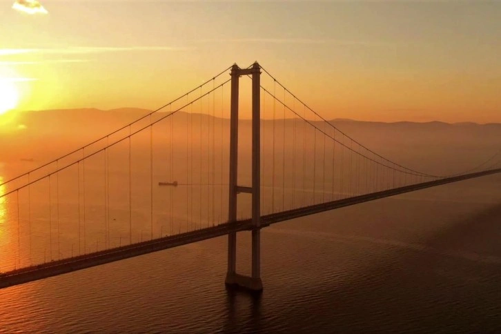 Kocaeli ile Yalova'yı bir birine bağlayan Osmangazi Köprüsünde gün doğumu, fotoğraf ve drone tutkunlarını cezbediyor. Masalsı görüntülerin ortaya çıktığı köprü gece ise farklı renklere bürünüyor.