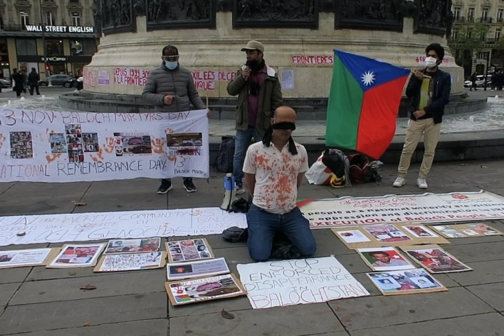 Fransa'nın başkenti Paris'te bulunan Republique (Cumhuriyet ) Meydanı, haftasonları Fransa'da yaşayan etkin grupların hak arama ve özgürlüğe kavuşma eylemlerine tanık oluyor. Meydanda farklı ülkelerin bünyesindeki etnik gruplar kendi bayraklarını açarak bölgelerinde yaşanan olumsuzlukları protesto ediyor. Son olarak, İran ve Pakistan arasında yer alan Belucistan bölgesinde yaşayanların maruz kaldığı olumsuzluklara dikkat çekmek için gösteri düzenlendi. İran ve Pakistan'ın Belucistan üzerindeki anlaşmazlığı nedeniyle bölge halkının yaşadığı olumsuzlukları dünyaya duyurmak isteyen bir gösterici ilginç bir yönteme başvurdu. Üzerinde kanı andıran kırmızı lekelerin yer aldığı bir tişört giyen gösterici, gözlerini siyah bir kumaş parçasıyla kapattı. Bir grup Beluç milliyetçisinin de bayrak açarak destek verdiği gösteri çevredekilerin ilgisini çekti.
