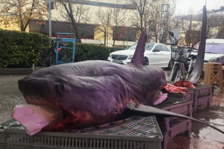 Çanakkale'de tutulan ve Eskişehir'e getirilen 476 kilogram ve 4 buçuk metre uzunluğundaki camgöz cinsi köpek balığı, Muharrem Şahin tarafından pazarda sergilenerek satışa sunuldu. Pazara alışveriş yapmak için gelen vatandaşlar, karşılarında köpek balığını görünce şaşkınlıklarını gizleyemedi. Kilogramı 40 TL'den satılan balığa ise ilgi büyük. Gün bitmeden 80 kilogramının satıldığını söyleyen balıkçı esnafı Şahin, tahminine göre 2 gün içinde biteceğini belirtti.