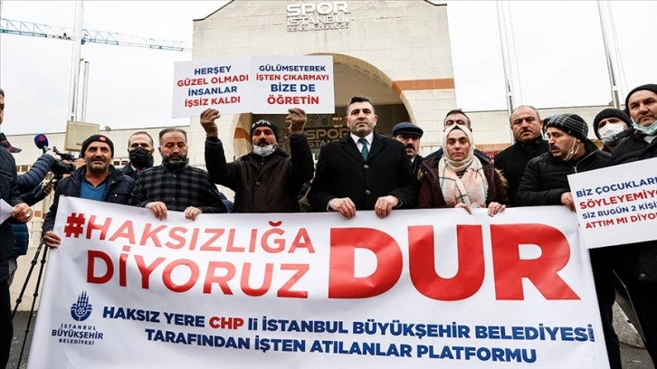Fatih'teki Spor İstanbul Genel Müdürlüğü önünde bir araya gelen bir grup işçi, "Haksızlığa dur diyoruz. Haksız yere CHP'li İstanbul Büyükşehir Belediyesi tarafından işten atılanlar platformu" yazılı pankart açtı.
