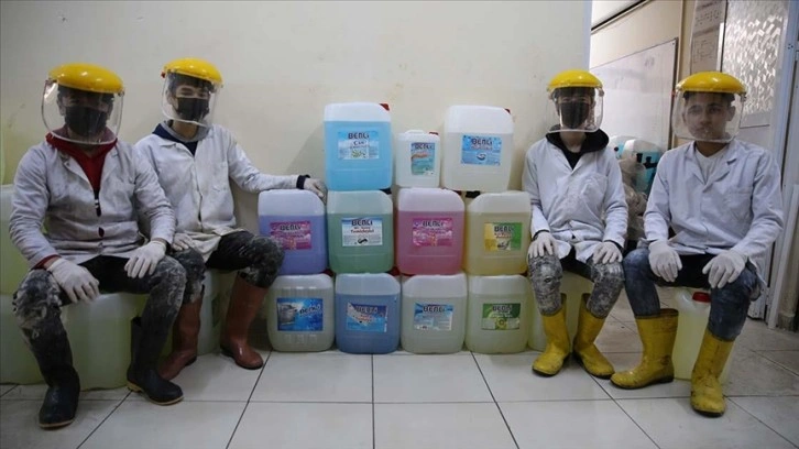 Haftanın 5 günü 8 öğretmen ve 70 öğrenciyle adeta fabrika gibi çalışan okulun atölyelerinde yüzey temizleyiciden sabuna, kolonyadan dezenfektana kadar çok çeşitli hijyen malzemeleri üretiliyor.