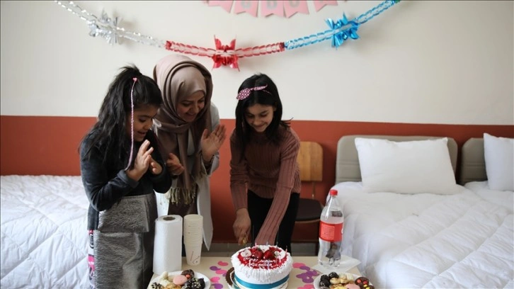 Ailelerin tüm ihtiyaçlarının karşılandığını belirten Mehmetbeyoğlu, "KYK yurtlarımızda kalan evlatlarımızdan Azra Nur'un doğum günüydü. Kızlarımla birlikte sürpriz yapmak istedik. Kendi çapımızda odasını süsledik ve doğum günü pastası hazırladık. Gönlüne girebildiysek, onu mutlu edebildiysek ne mutlu bize. Aynı şekilde yurdumuzda kalan diğer öğrencilere de pasta dağıtımında ve ikramlarda bulunuldu. Her zaman misafirlerimizin yanındayız." ifadelerini kullandı.