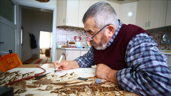Nevşehir'de, ahşap yakma sanatıyla resim çizen işçi emeklisi 66 yaşındaki Mustafa Öncül, birbirinden güzel eserler ortaya çıkarıyor.