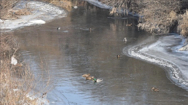 Kars Çayı'nın Kafkas Üniversitesi yerleşkesindeki donmayan bölümünü mesken tutan yeşilbaş ördeklerin, burada yavrularıyla yiyecek araması görüntülendi.