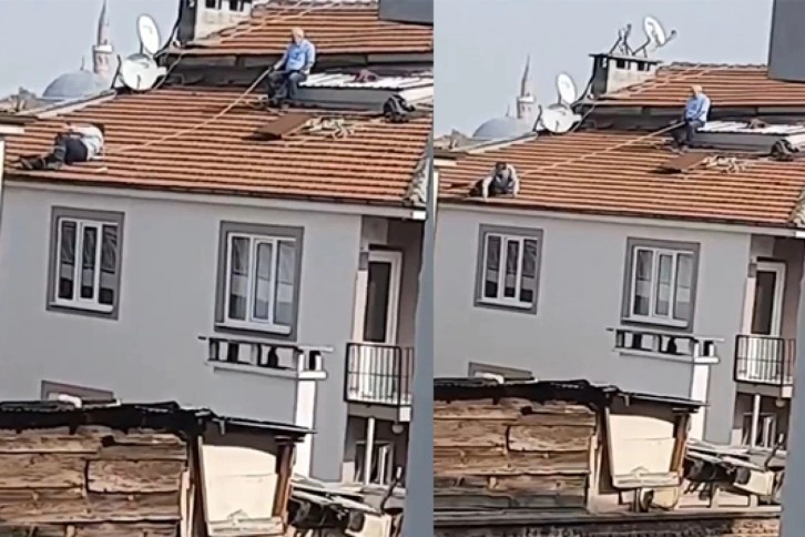 Olay Yıldırım Gökdere Mahallesinde meydana geldi. Çatı tamiratı yapan iki kişi, bellerine bağladıkları halatla çatıda adeta ölüme meydan okudu. Çatıda kimi zaman yatarak, kimi zaman da tehlikeli şekilde yürüyerek tamir yapan şahısları yoldan geçenler korku dolu gözlerle izledi. Uzun süre çatıda tamir işlemine devam eden iki şahıstan biri çatının en uç noktasına kadar geldikçe yürekler ağızlara geldi. O ânlar ise cep telefonu kamerasıyla kaydedildi.