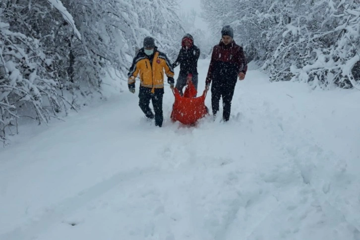 Karabük'ün Yenice ilçesinde evinde rahatsızlanan 87 yaşındaki Nazife Alagöz'e ulaşmak isteyen ambulans, karla kaplı yolda çıkamayınca, yaşlı kadın İl Özel İdare ekiplerinin yardımı ile evinden alındı.
