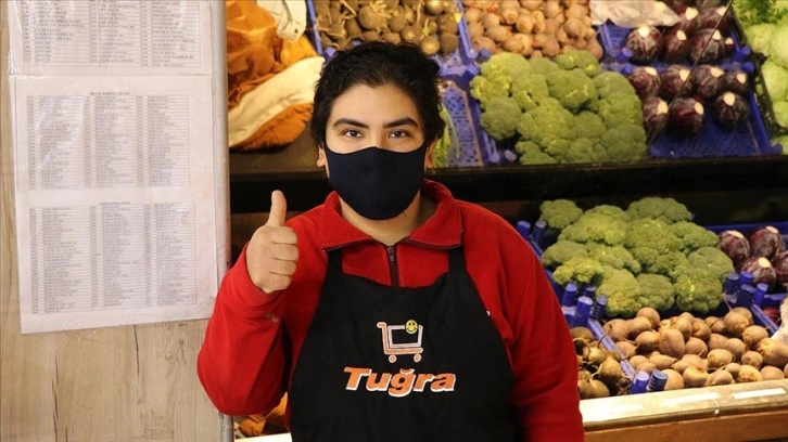 Çocukken geçirdiği rahatsızlık nedeniyle yüzde 70 zihinsel engeli olan 21 yaşındaki Buket, 3 yıldır görev yaptığı markette çalışkanlığı ve güler yüzüyle dikkati çekiyor.